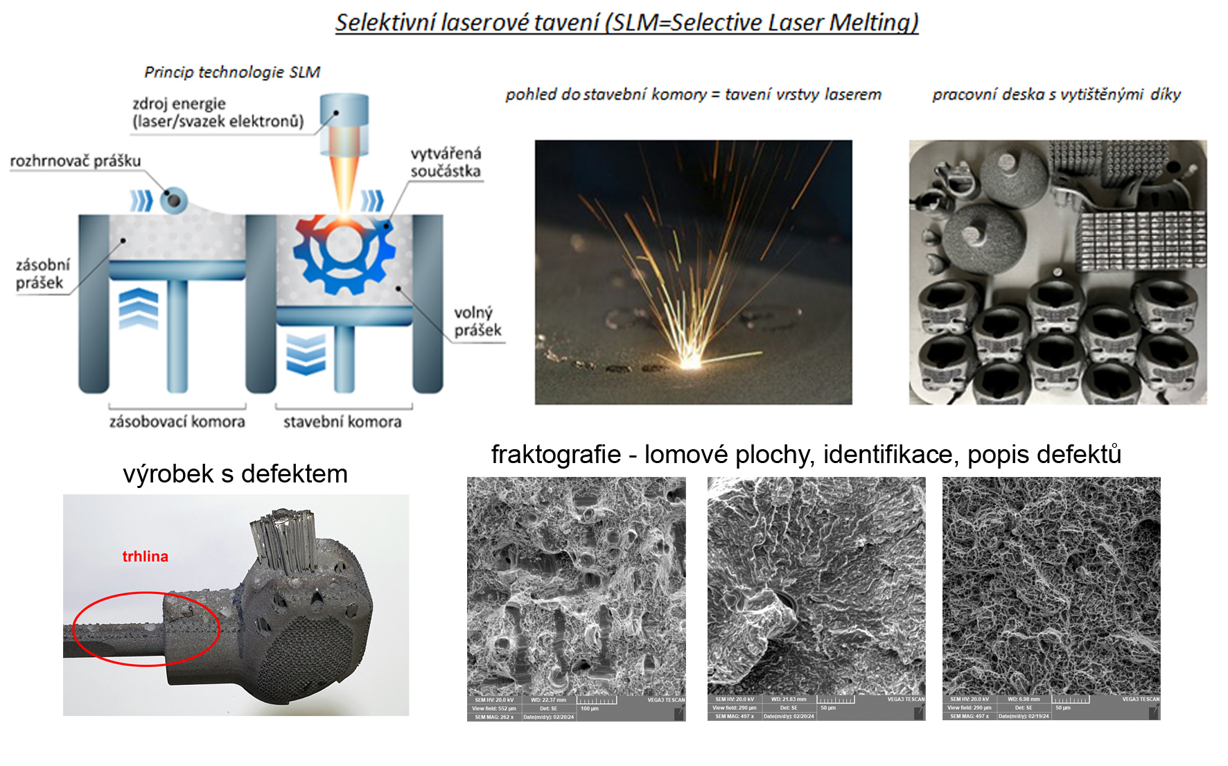 Metody 3D tisku umožňují zhotovení kovových výrobků prakticky libovolných tvarů. Lze takto vyrábět kompaktní i vysoce porézní výrobky. 3D tiskem lze vyrábět např. v oblasti medicíny na míru klouby, části kostí, fixační prvky i porézní implantáty sloužící k vyplnění kostních defektů. U určitého počtu výrobků však dochází k tomu, že pevnost a houževnatost materiálu neodpovídá předpisům a požadavkům pro daný výrobek. Dokonce někdy dojde až k provoznímu lomu a porušení výrobku. Příčinou jsou vnitřní defekty v materiálu vznikající již při samotném 3D tisku. V rámci práce se proto ve spolupráci s průmyslovým výrobcem 3D tištěných součástek a implantátů pokusíme nalézt a popsat možné příčiny těchto problémů. Nejprve bude provedena detailní metalografická analýza materiálu na světelném a elektronovém mikroskopu. Bude popsána mikrostruktura a identifikovány vnitřní vady materiálu. V další části bude proveden fraktografický rozbor lomových ploch na elektronovém mikroskopu. Defekty budou popsány a bude vyhodnocen jejich tvar, velikost a počet. V další části se pokusíme dát tyto parametry do souvislosti s mechanickými vlastnostmi a s parametry procesu 3D tisku výrobku. Závěrem by mělo být doporučení výrobci, jak upravit, modifikovat proces 3D tisku tak, aby byly vnitřní vady materiálu maximálně eliminovány a výrobek aby splňoval předepsané požadavky.