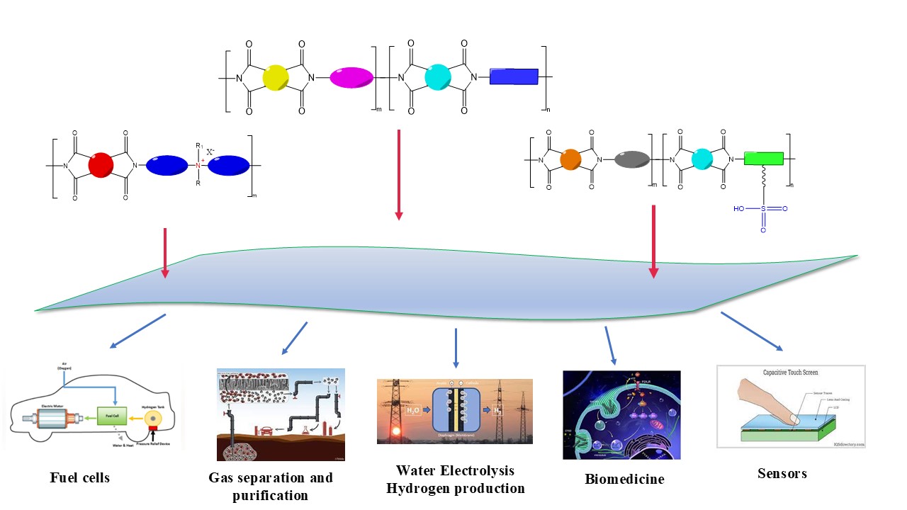 Polyimidy (PI) jsou polymery s vysokou mechanickou, chemickou a dielektrickou stabilitou v širokém teplotním rozmezí. Tyto vlastnosti vedou k možnosti využití PI jako polymerních membrán. Chemickým složením, tj. volbou vstupních monomerů, lze do určité míry ovlivňovat strukturu výsledného PI. Použití monomerů, obsahujících aniontové nebo kationtové skupiny umožňuje získat polyimidy, které lze použít jako kationtově nebo aniontově vyměnné membrány.
