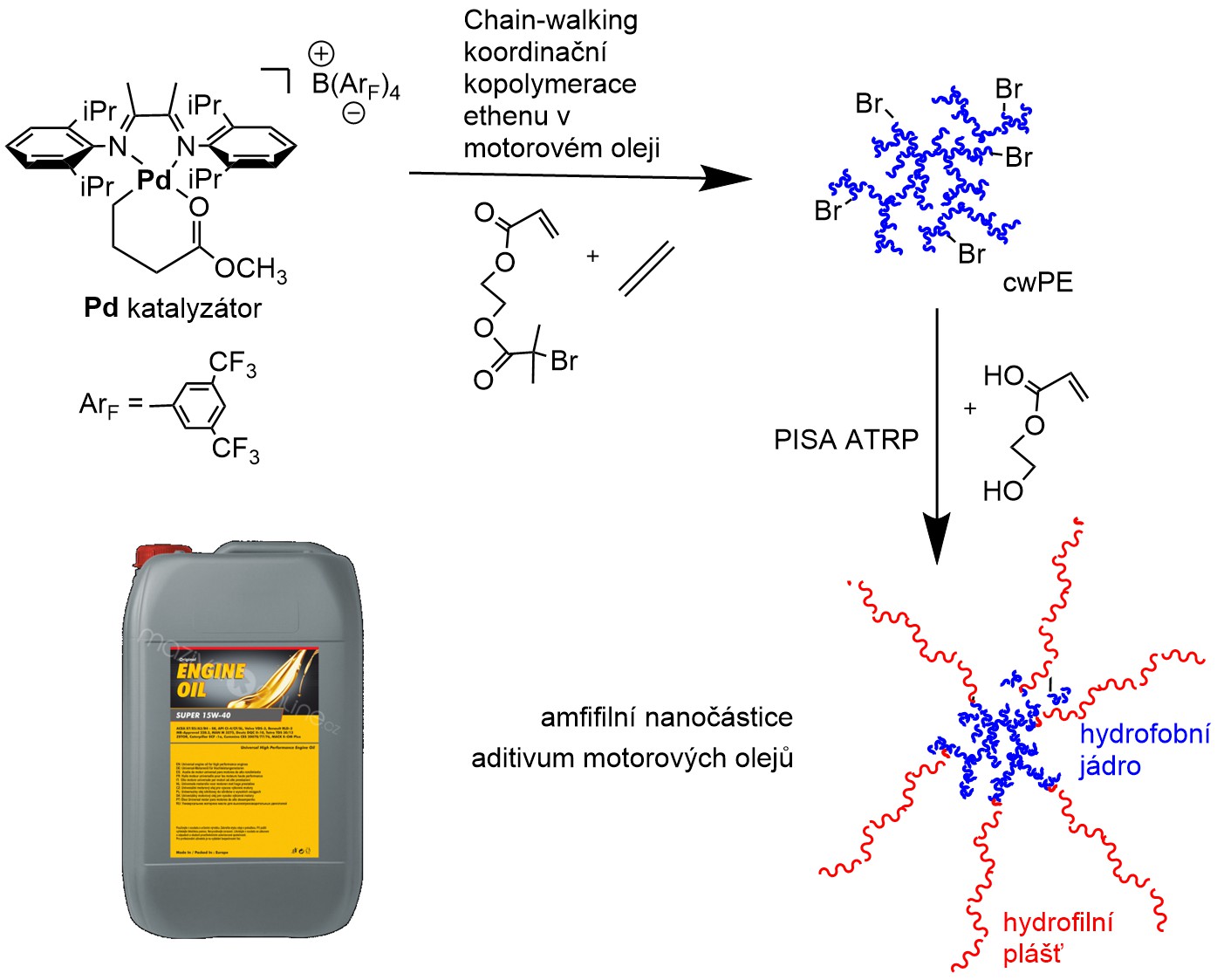 Student bude připravovat pomocí chain-walking polymerace katalyzované paladnatými komplexy náhodné kopolymery ethenu s bromovaným akrylátovým monomerem (inimerem), který do struktury kopolymeru vnese Br iniciační skupiny pro následující ATRP polymeraci polárního vinylového monomeru, např. hydroxyethelakrylátu. Polymerace bude probíhat v nepolárním prostředí a během druhé fáze, tj. ATRP polárního monomeru dojde ke srážení vznikajících roubovaných kopolymerů příliš polárních na to, aby byly rozpustné v nepolárním prostředí. Cíleným nepolárním prostředím budou minerální oleje, které budou vnikajícími kopolymery aditivovány za ůčelem přípravy speciálních vysokovýkonových motorových olejů vhodných pro závodní automobily nebo letadla.Práce je řešena v rámci projektu GA ČR ve spolupráci se zahraničním partnerem (Německo).