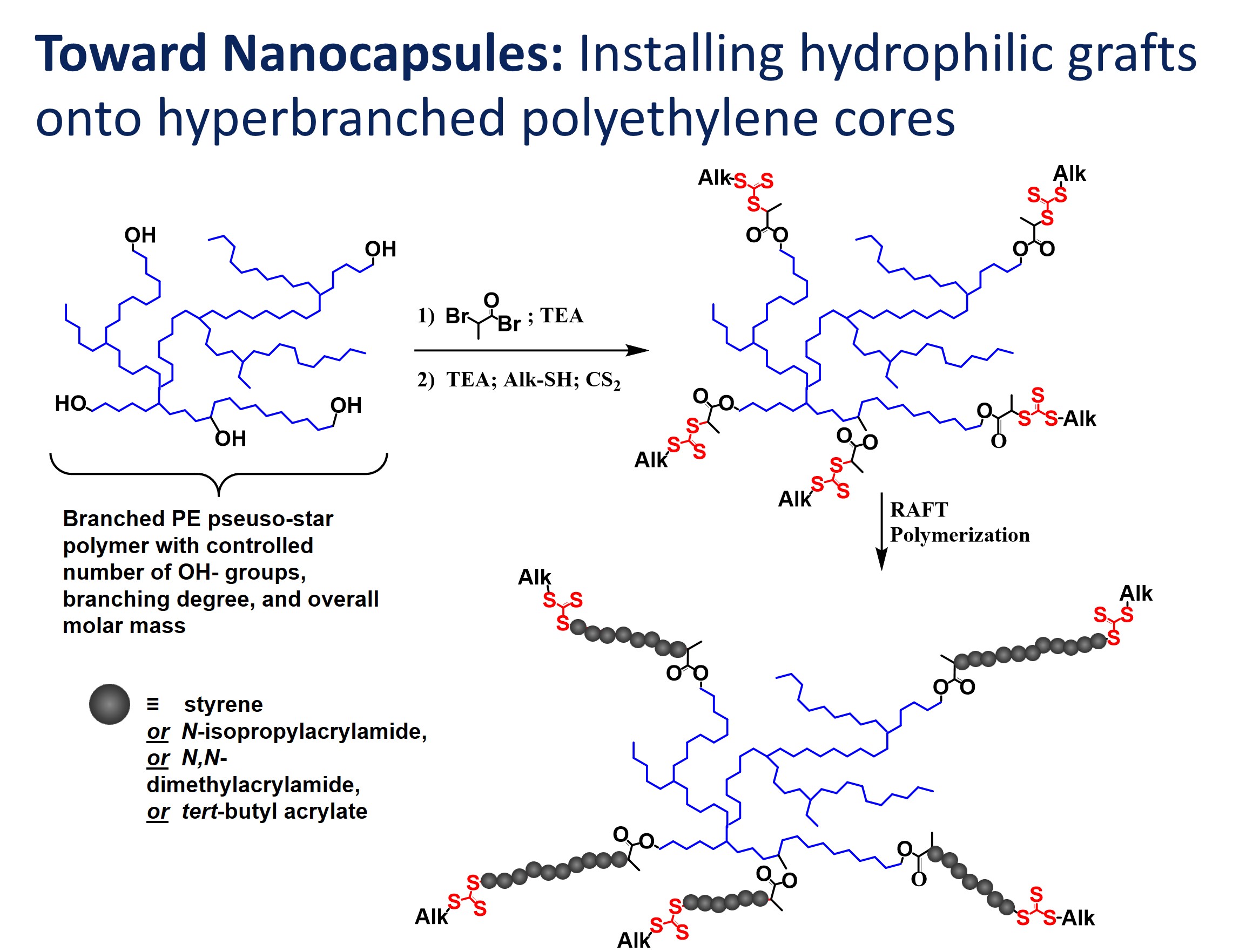 Hydroxy-functional branched polyethylene will be synthesized by chain-walking catalysis. The hydroxy termini will be used to install ATRP and RAFT chain transfer agents (CTAs) in two subsequent reaction steps. The capability of those macro-CTAs for controlling polymerizations of acrylates and acrylamides will be assessed. Polymeric materials will be characterized by UV/visible extinction spectroscopy, NMR, SEC. The work will be solved in framework of international project DFG-CSF.