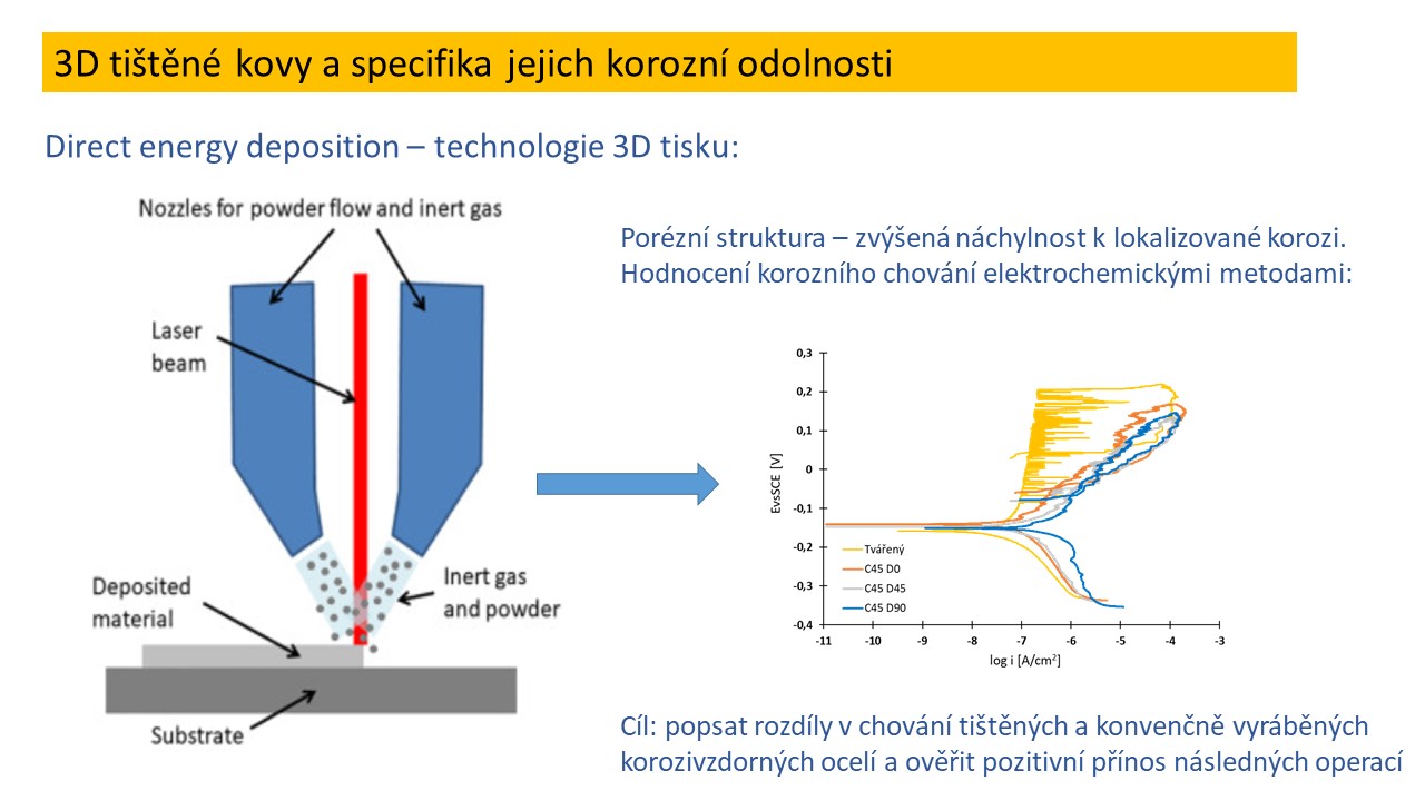 3D tisk představuje perpektivní a v praxi stále šířeji využívanou technologií výroby kovových prvků s vysokými nároky na tvarovou přesnost. Běžně tištěnými materiály jsou i korozivzdorné oceli. Jejich korozní odolnost je založena na stabilitě pasivní vrstvy, která může být ohrožována specifickou mikrostrukturou tištěného materiálu. Cílem práce bude popsat rozdíly v chování tištěných a konvenčně vyráběných korozivzdorných ocelí a ověřit pozitivní přínos následných operací ke korozní odolnosti jako např. isostatického lisování