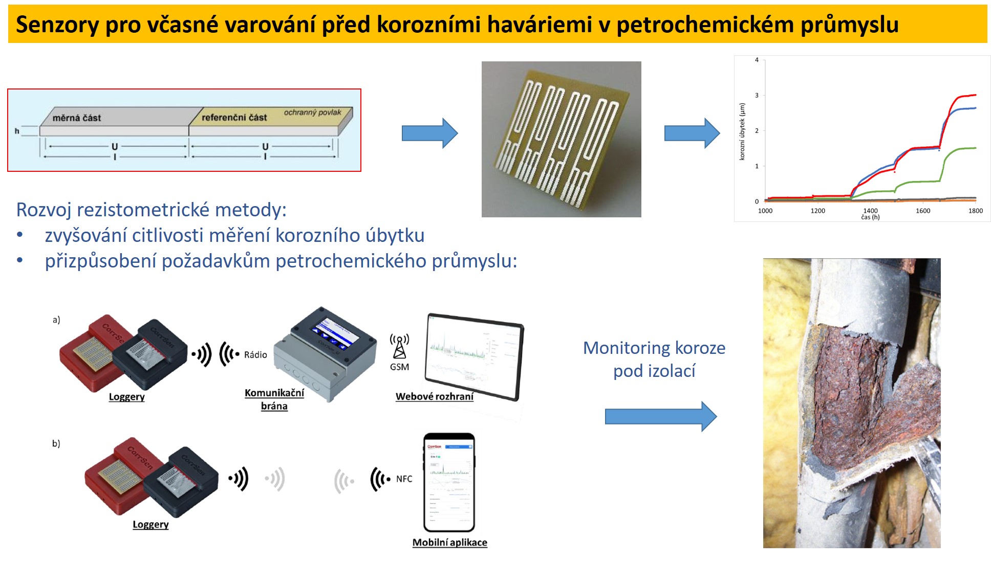 Koroze v minulosti způsobila mnoho havárií v chemickém a petrochemickém průmyslu, které zapříčinily obrovské ekonomické ztráty a ohrozily zdraví a bezpečnost pracovníků. Nové korozní senzory budou přizpůsobeny provozním podmínkám v petrochemickém průmyslu. Správná funkce a spolehlivost bude ověřevána jak v modelových laboratorních podmínkách, tak v reálném provozu.