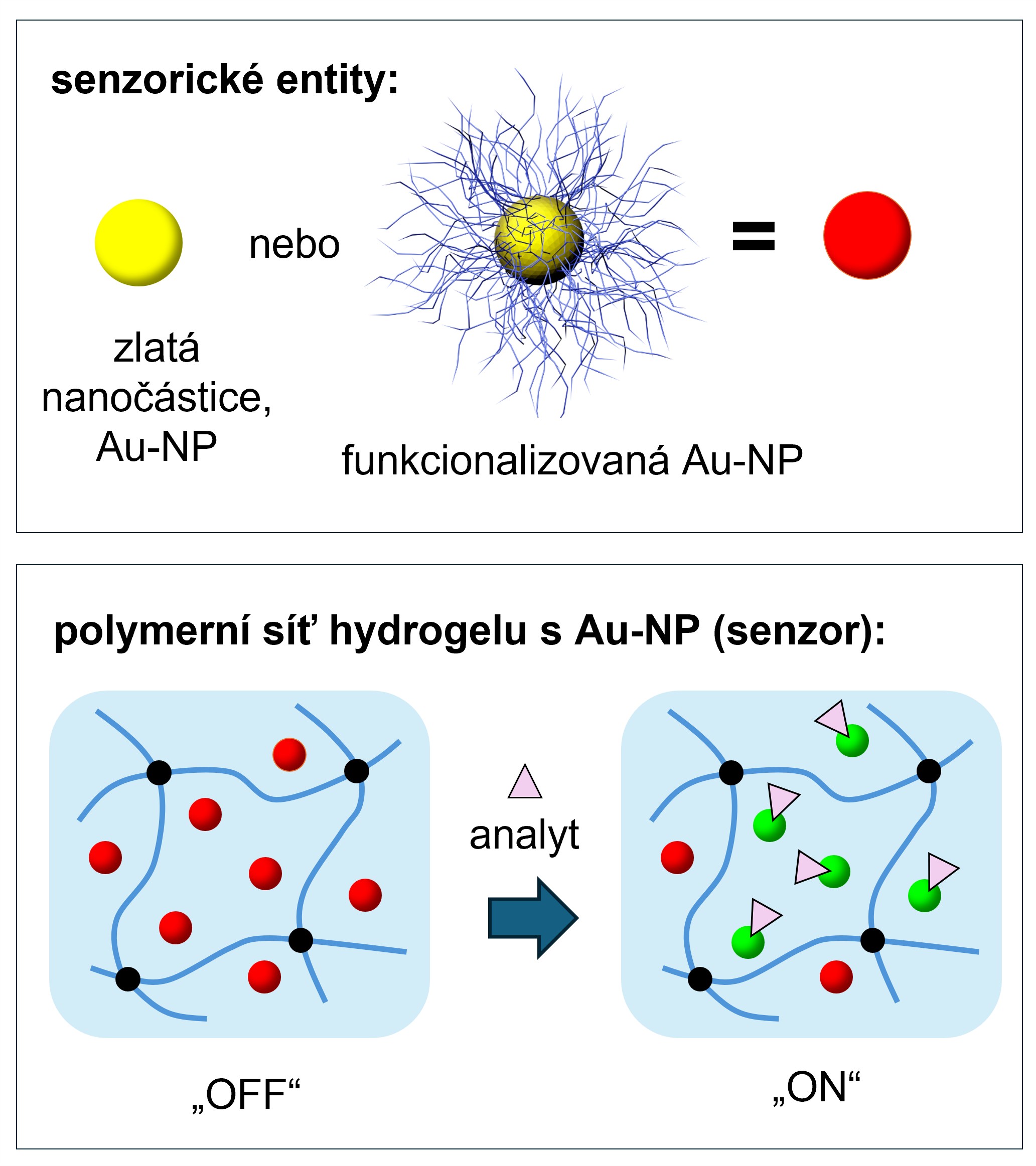 Je-li zlato miniaturizováno na nanometrové rozměry, dochází k pozoruhodné změně jeho barvy – typicky na sytě rubínově červenou. Toto zbarvení je důsledkem rezonanční excitace valenčních elektronů viditelným světlem, známé jako lokalizovaná povrchová plazmonová rezonance (LSPR). Přesná spektrální poloha této rezonance závisí na dielektrickém prostředí částic, což je činí účinnými optickými sondami pro detekci změn v jejich okolí (na základě mechanismu optické transdukce signálu). Aby bylo možné zlato využít pro senzorické aplikace, je třeba začlenit nanočástice jako jednotlivé entity do matrice, která umožní efektivní difuzi analytu k jejich povrchu. Polymerní hydrogely, často průhledné a měkké materiály, jsou pro tento účel ideální: poskytují hydratované, propustné a biokompatibilní prostředí a nabízejí tak široké spektrum potenciálních aplikací, zejména v oblasti zdravotnictví a biotechnologií. Cílem tohoto projektu je připravit hydrogely se zabudovanými sférickými a tyčinkovitými zlatými nanočásticemi a ověřit jejich využitelnost jako senzorů změn v prostředí.